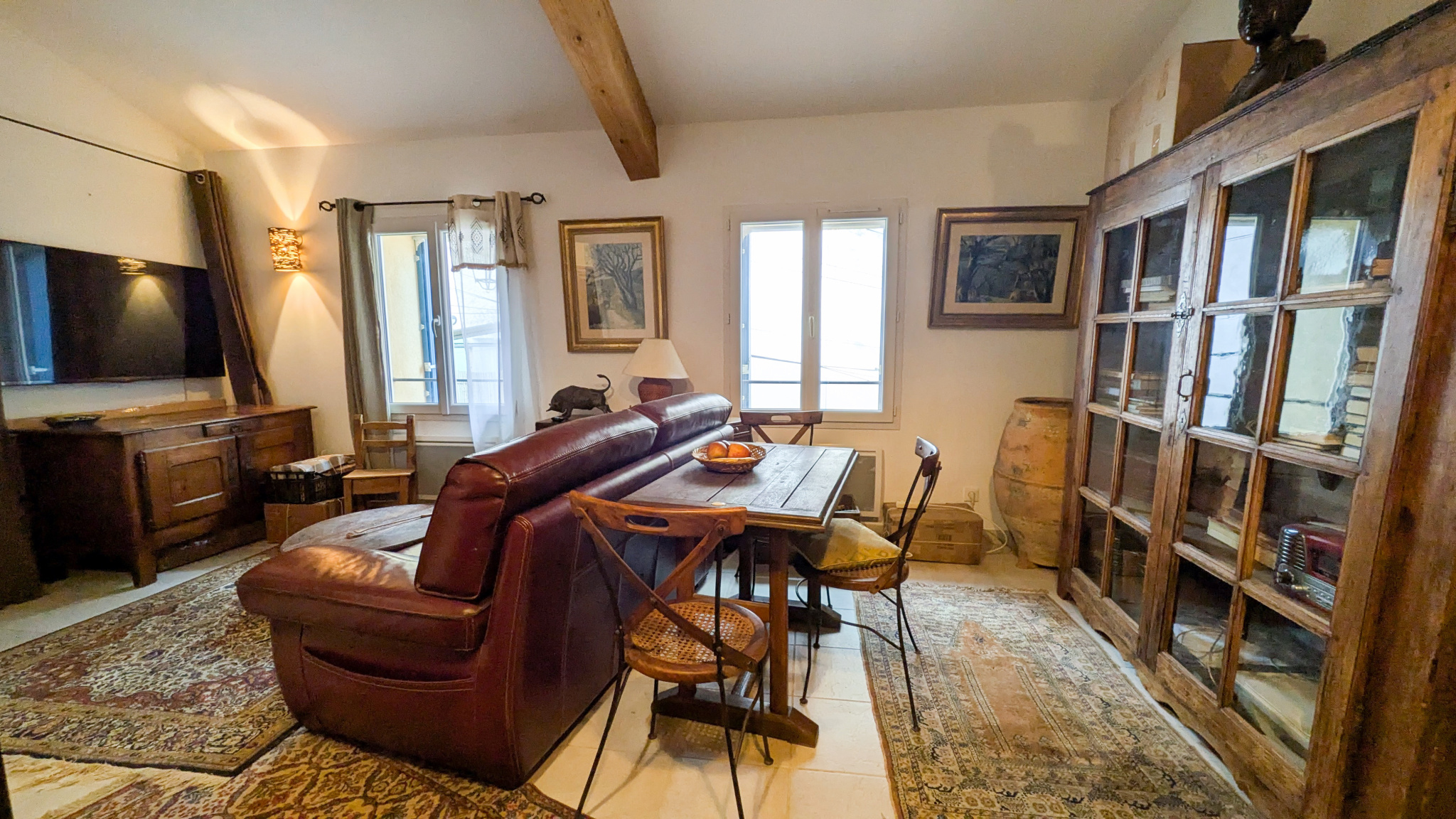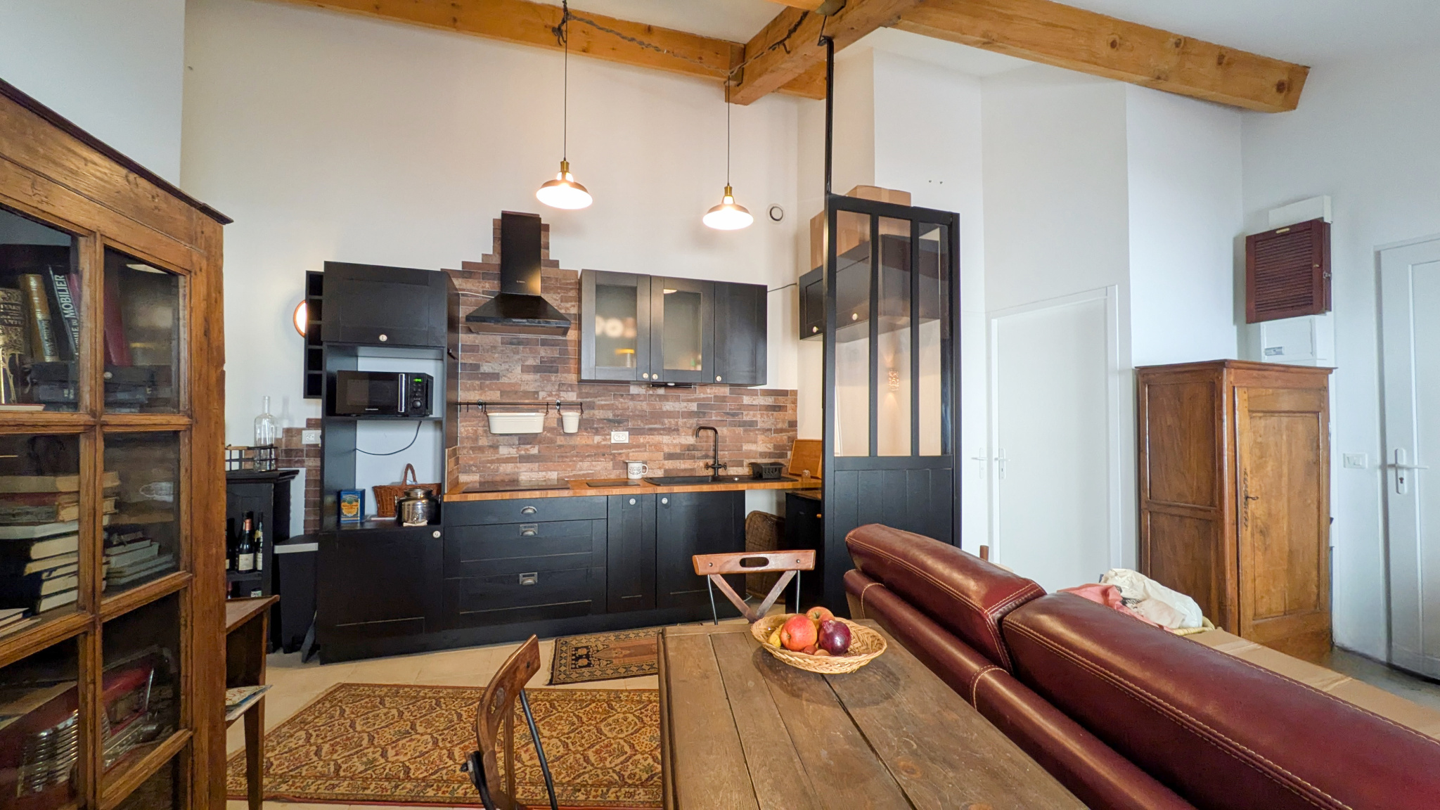 Une salle d'eau fonctionnelle et un wc séparé complètent cet ensemble bien pensé. La hauteur sous plafond et les poutres apparentes ajoutent au cachet des lieux.