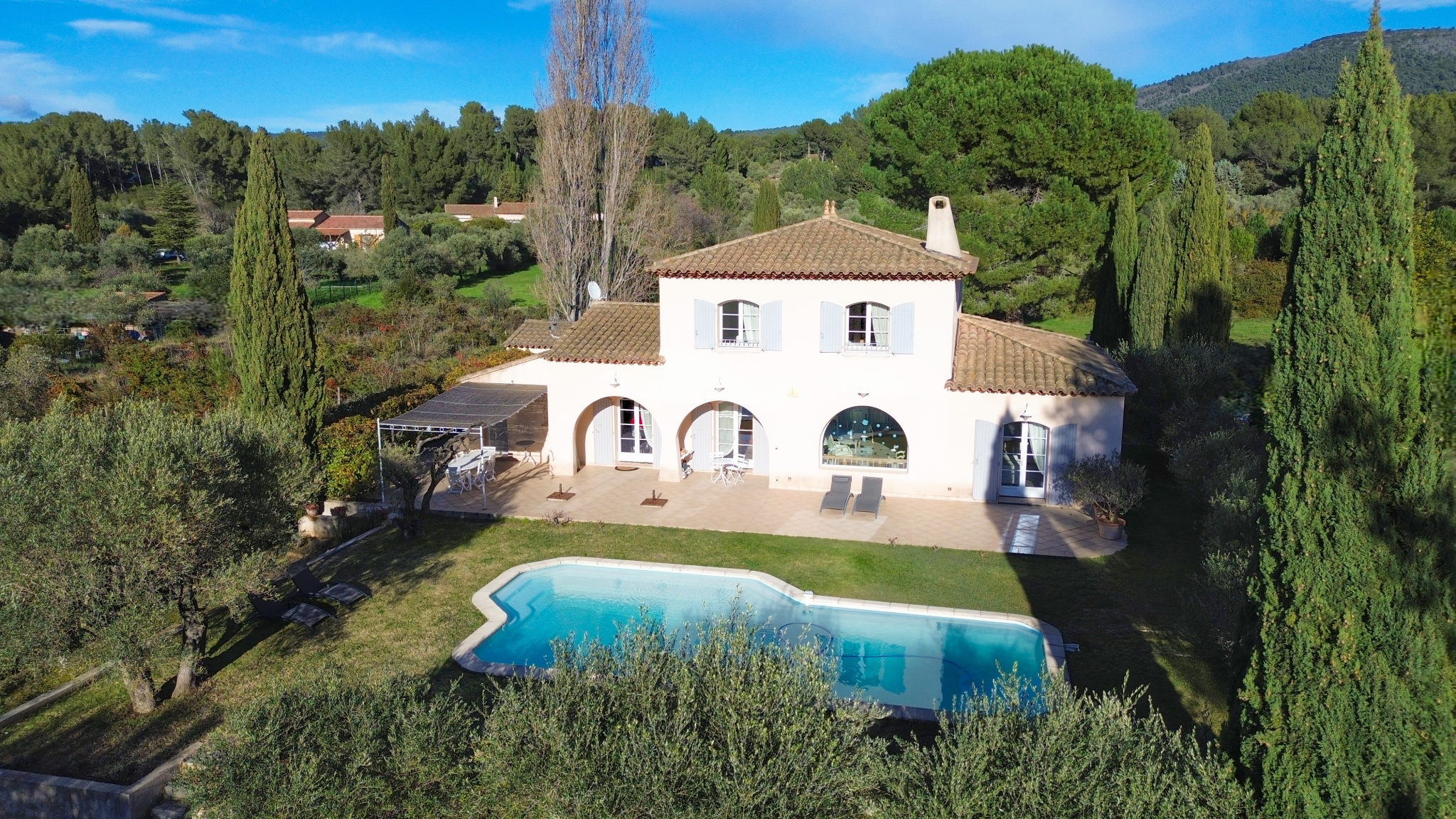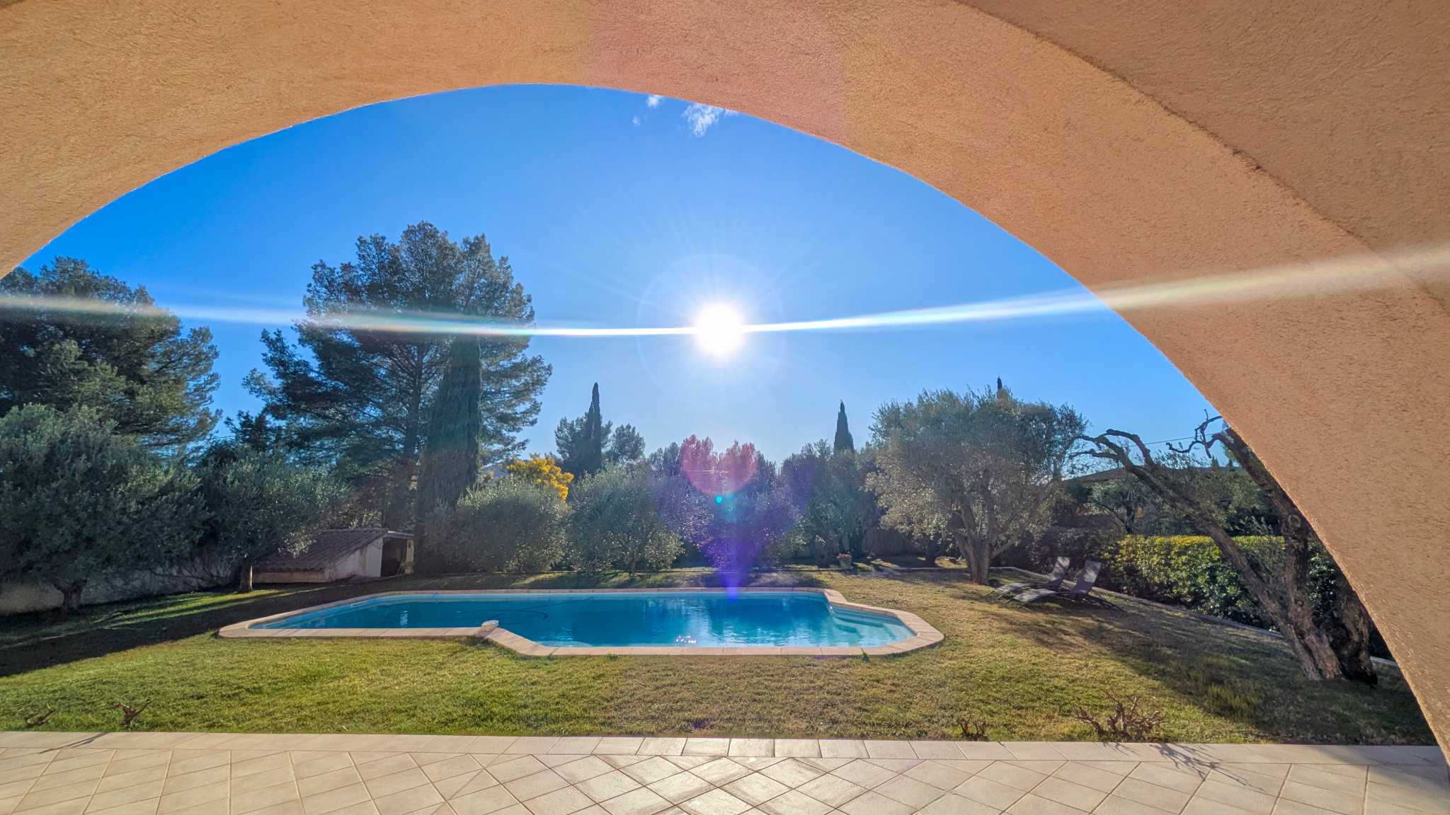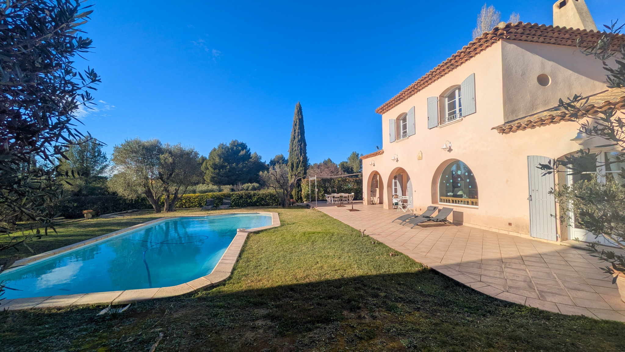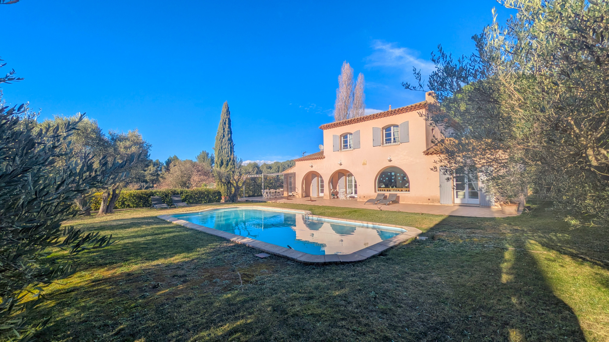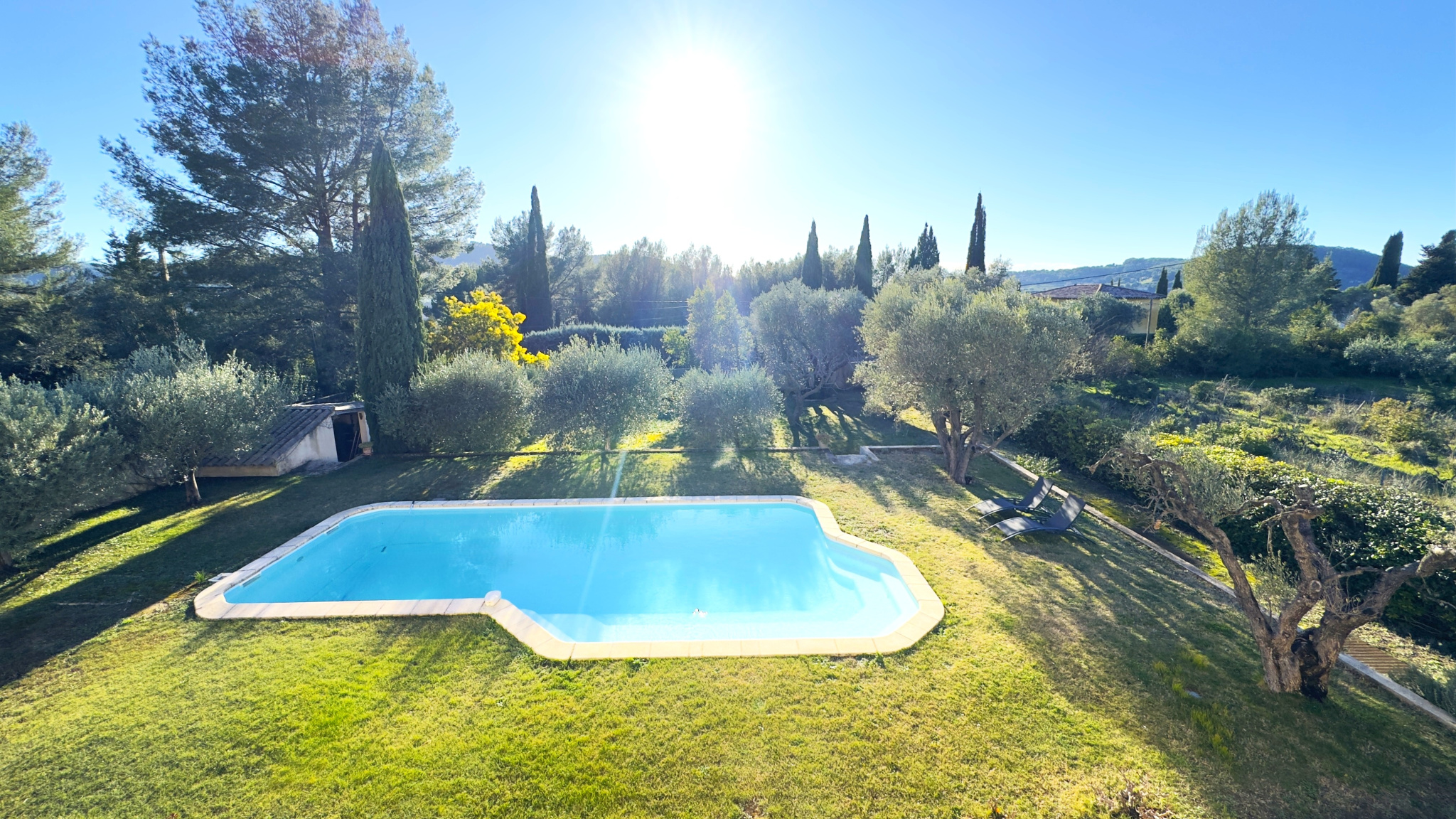 À l’extérieur, le jardin paysager, sublimé par de magnifiques oliviers, invite à la détente autour de la piscine. Le canal de Provence sur la parcelle constitue un atout précieux pour l’entretien du jardin. Une douche et WC extérieurs sont également présents.