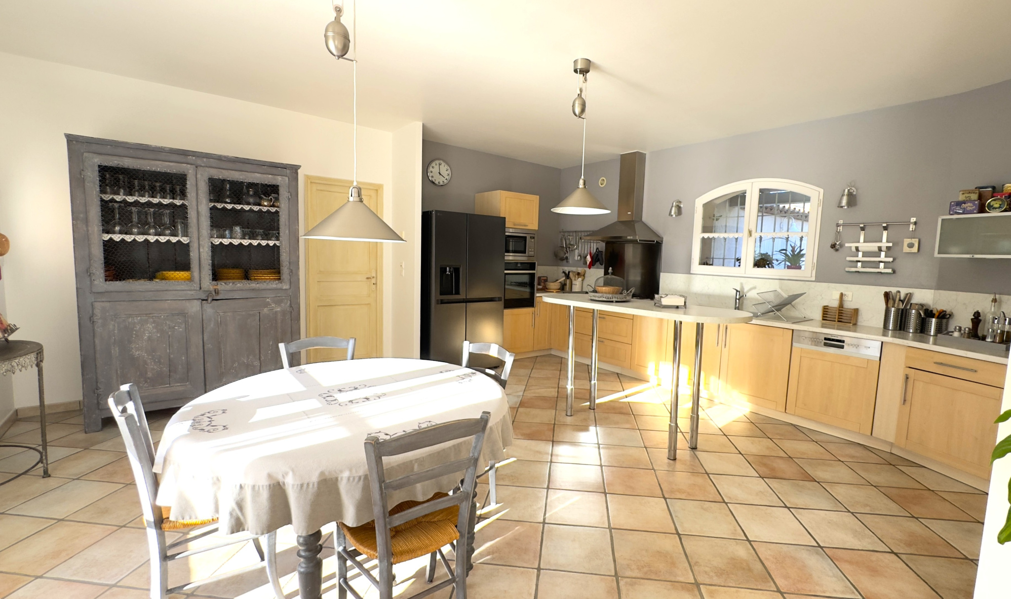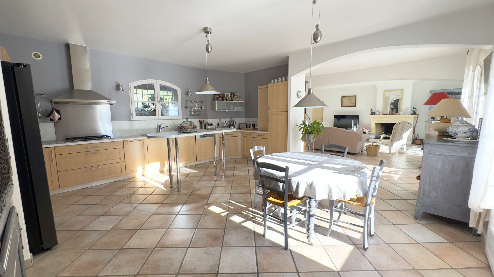 Dès l’entrée, le charme opère. Le séjour, baigné de lumière grâce à son exposition sud-ouest, séduit par son volume (plus de 72m2) sa cheminée chaleureuse et sa superbe baie vitrée en voûte, véritable signature architecturale de la maison. Cet espace de vie s’ouvre naturellement sur une élégante cuisine avec coin repas, prolongée par une arrière-cuisine discrète et fonctionnelle, offrant un accès direct au garage.