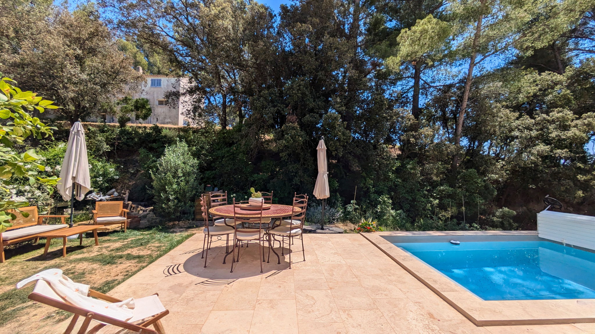 L'extérieur de la maison est absolument charmant, avec sa terrasse en travertin et joli jardin côté sud, la piscine traditionnelle équipée d’un volet électrique sur mesure ainsi qu'un auvent de 24m2 permettant de stationner aisément en toute sécurité.