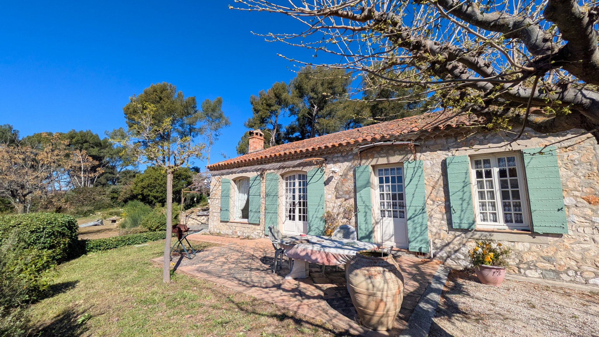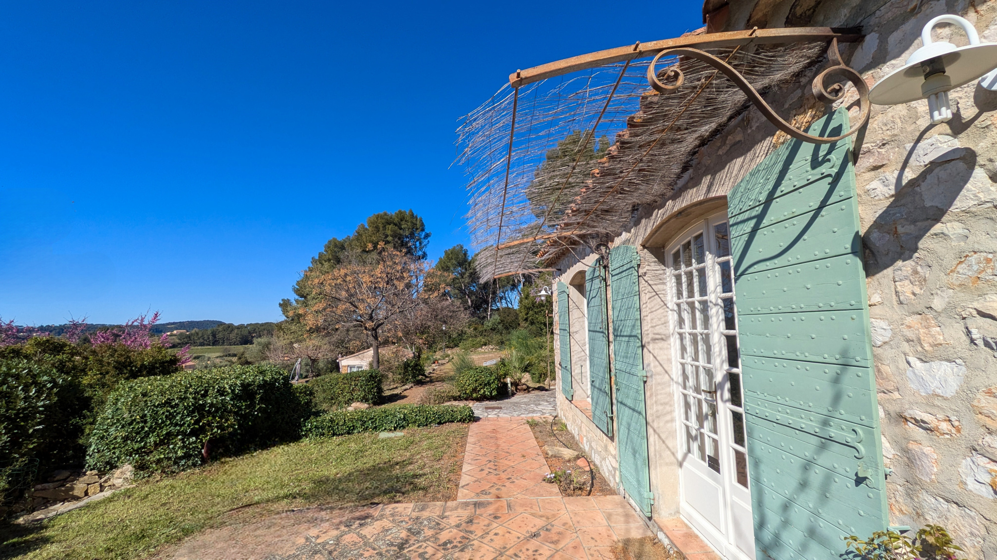 Développant environ 133m2 habitales, la maison séduira par son charme provençal, sa façade parée de pierres, volets traditionnels à lames croisées, double rang de génoise, fenêtres cintrées et poutres apparentes.