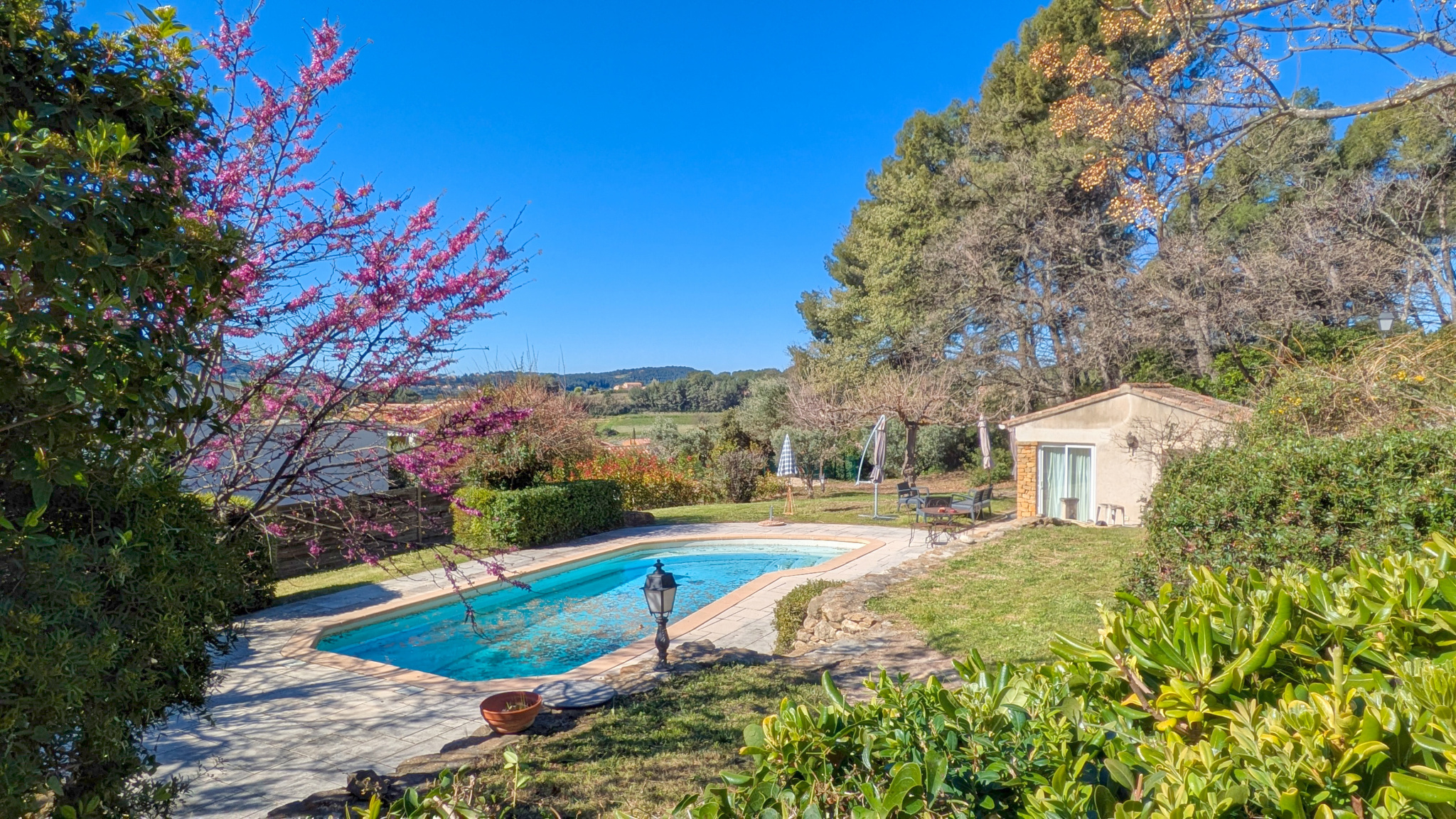 A l'extérieur, un vaste jardin, une piscine 10x4m avec son poolhouse aménagé de 17m2 (kitchenette et sanitaires), un carport double et une remise de 15m2. Raccordement au Canal de Provence.