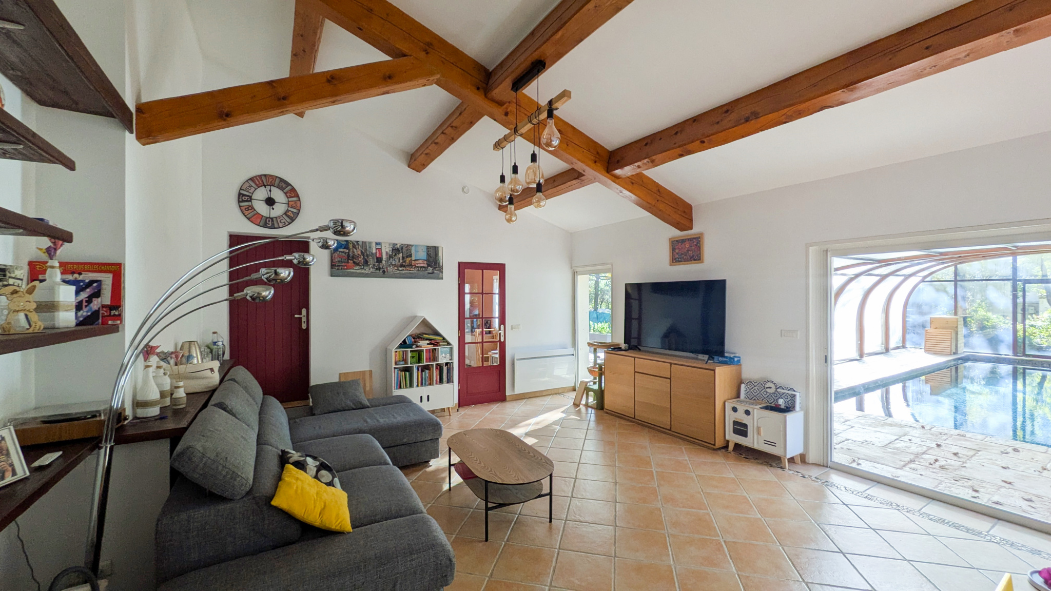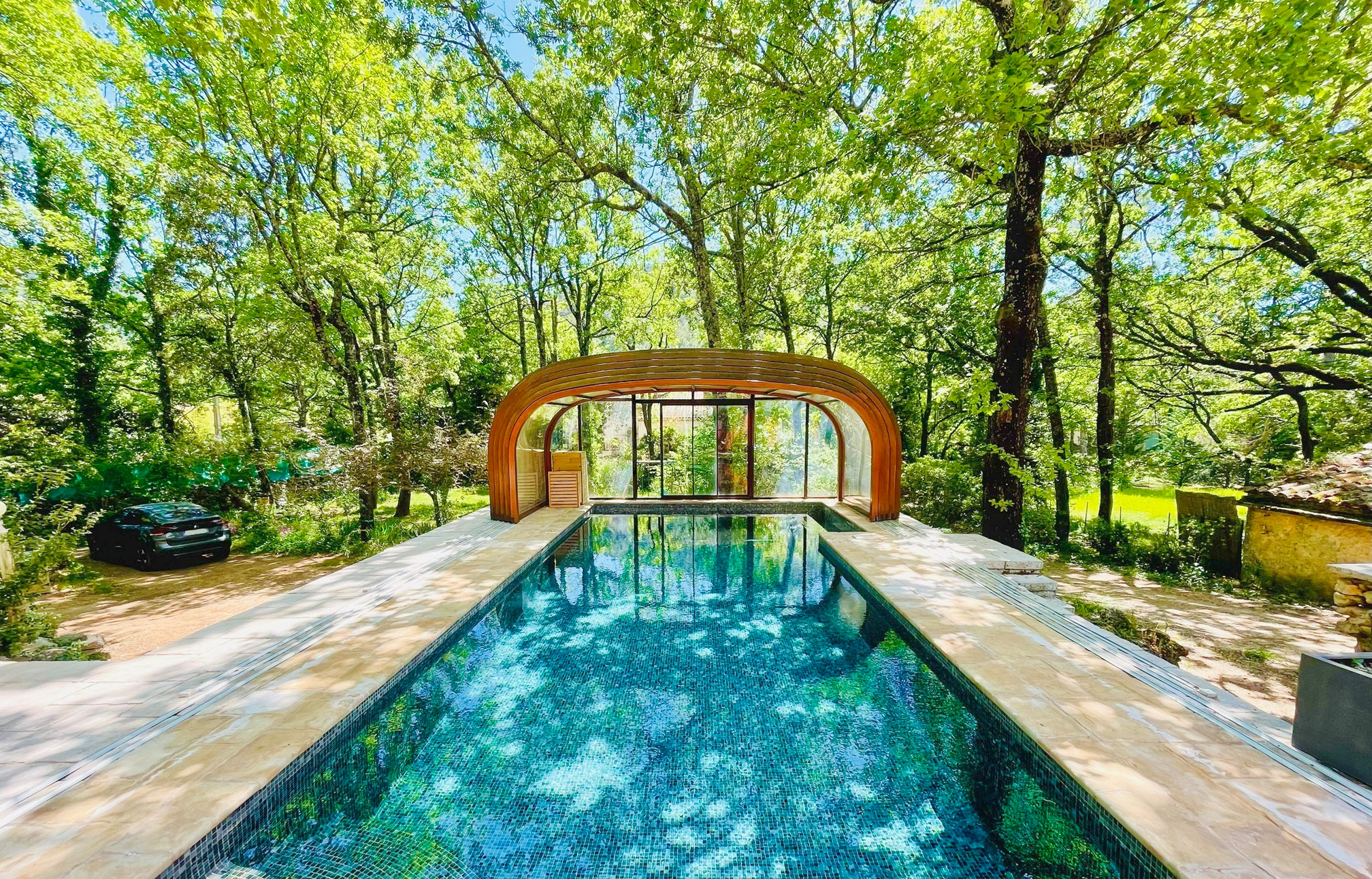 A l'extérieur, un terrain plat, clos et arboré de près de 1 700 m2 et une superbe piscine carrelée et chauffée, couverte par un abri téléscopable, idéale pour prolonger la saison de baignade.