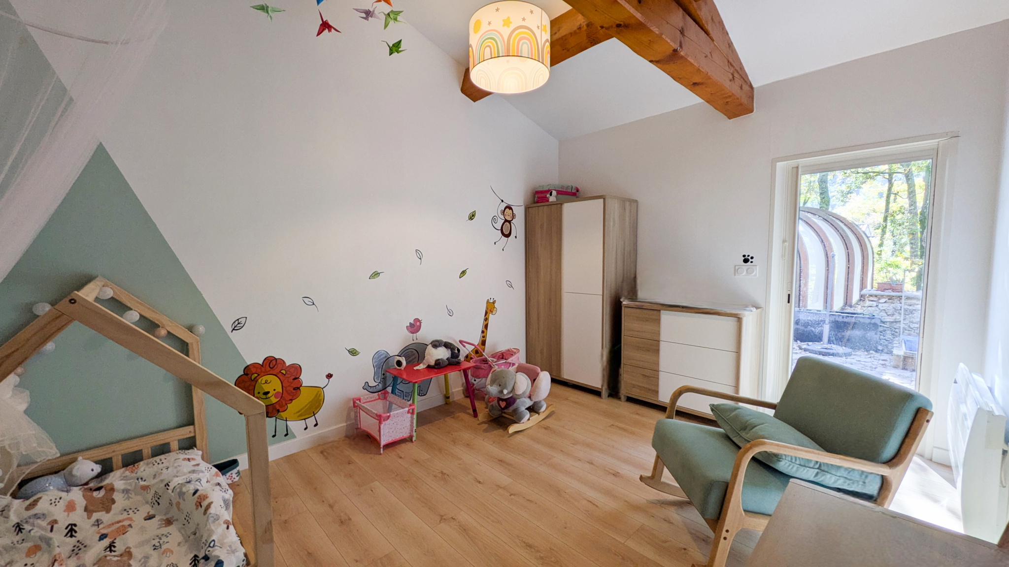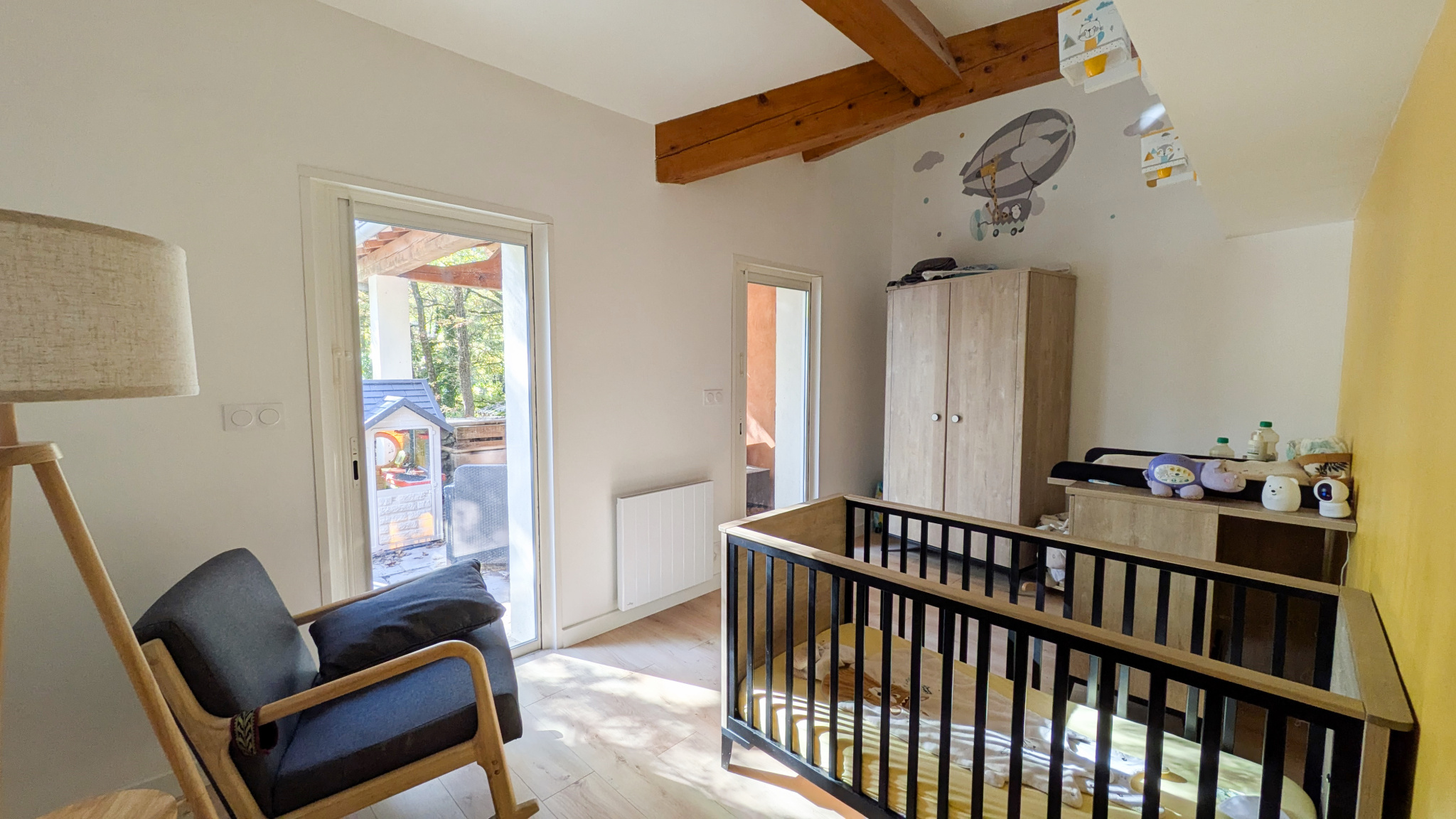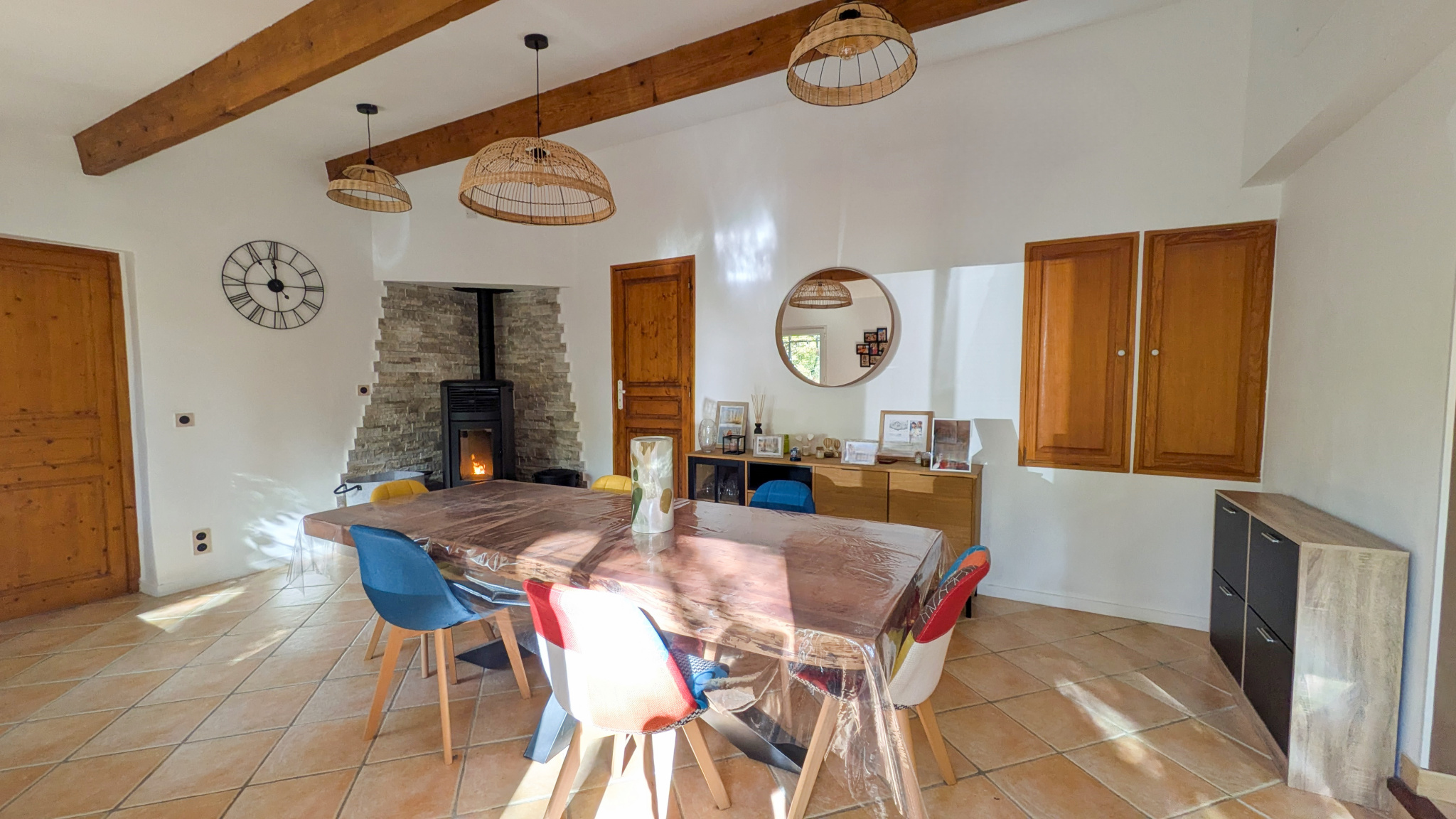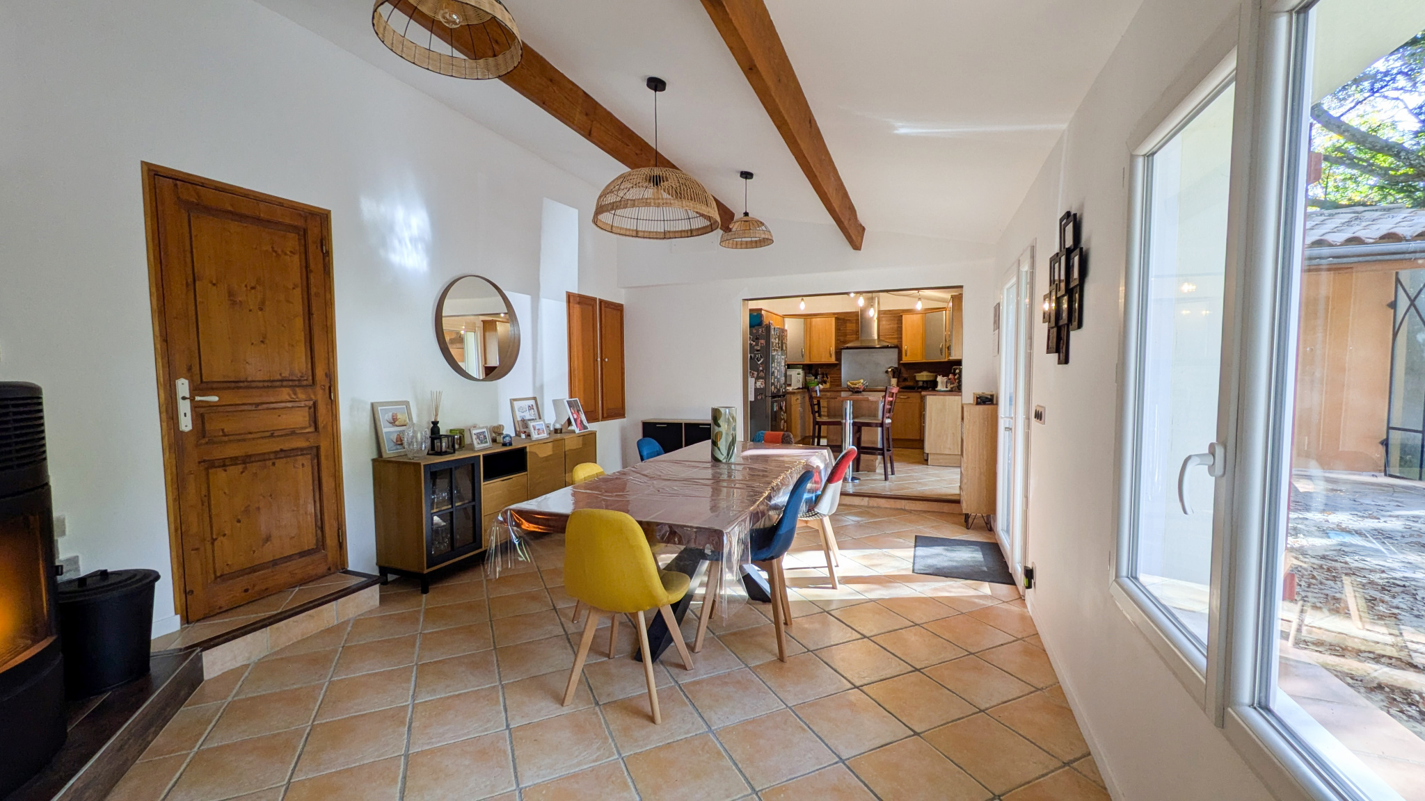 La maison développe environ 165 m2 habitables, quasiment exclusivement de plain-pied, organisés de manière fonctionnelle et lumineuse. Elle offre un bel espace de vie, entièrement tourné vers le sud : séjour chaleureux avec belle hauteur sous plafond, salle à manger avec poêle à granulés (diffusion de chaleur), cuisine ouverte tout équipée, le tout donnant sur une large terrasse. Vous apprécierez les quatre chambres, dont l'une en mezzanine, avec dressing, ainsi que le grand bureau. La salle de bains est très fonctionnelle, avec douche et baignoire. Une seconde salle d'eau d'appoint, deux wc dans la maison.