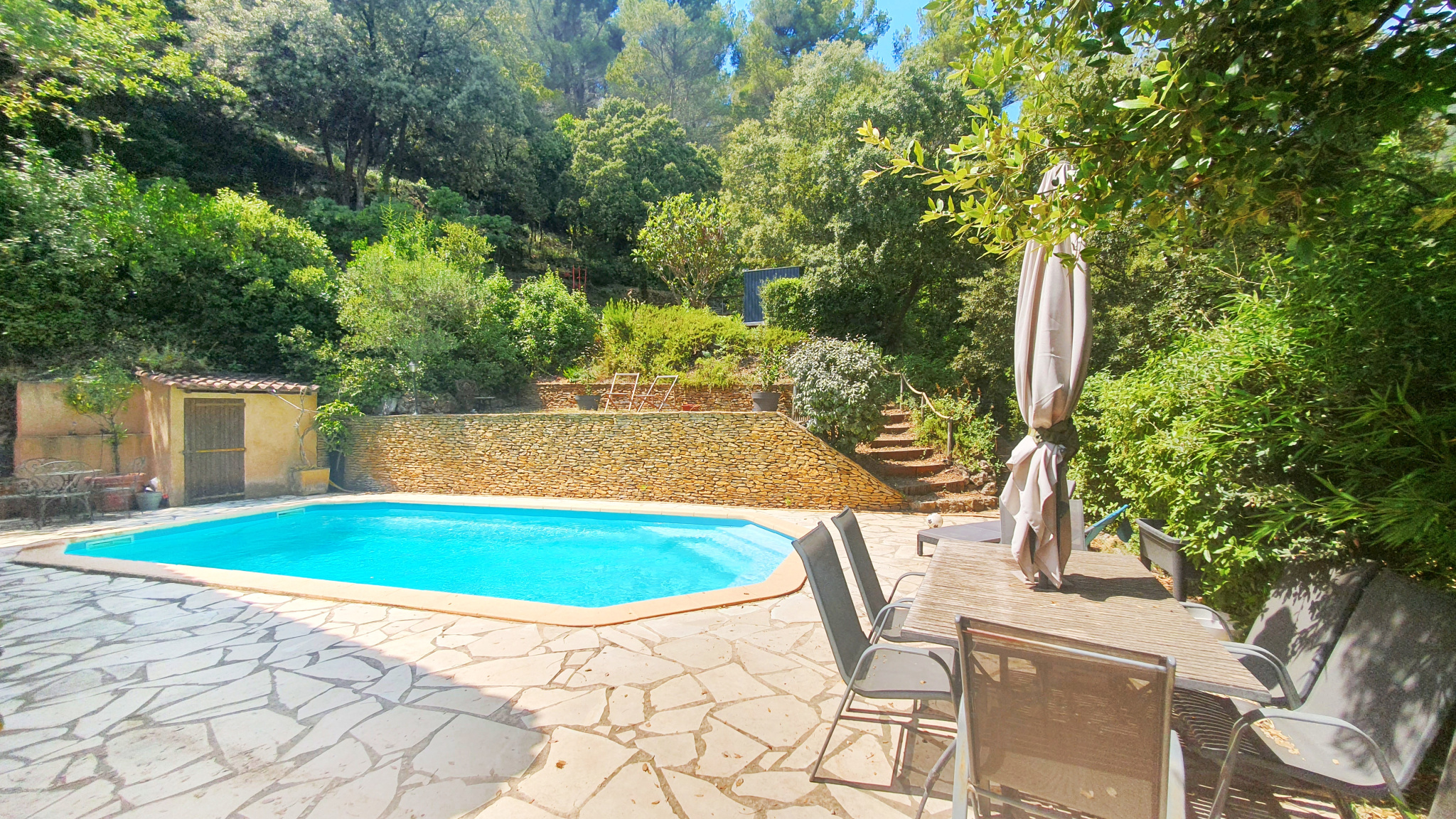 A l’extérieur, devant la maison, une belle terrasse avec une pergola à l’Est, permet de prendre les repas dehors et profiter de la nature environnante. Une grande piscine au sel, bien exposée et isolée par de beaux murs de restanque, ouvre sur une partie plus nature du terrain, bien arborée, permettant de laisser libre court à votre imagination pour vos enfants ou vos animaux de compagnie, puisque qu’il est entièrement clôturé et ouvert grâce à un portail électrique. Des abris de jardin permettront de stocker tous vos outils et un arrosage automatique le gardera toujours bien vert.