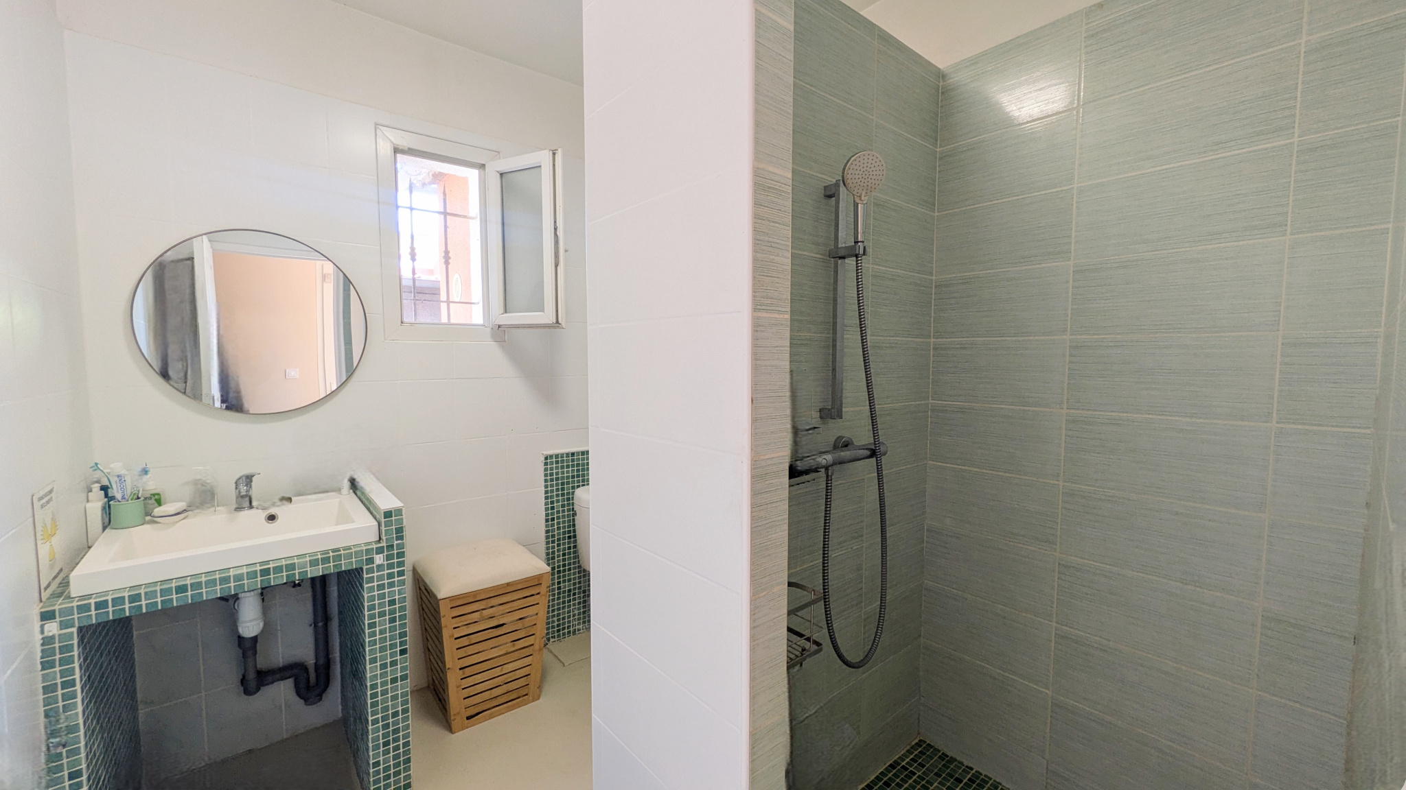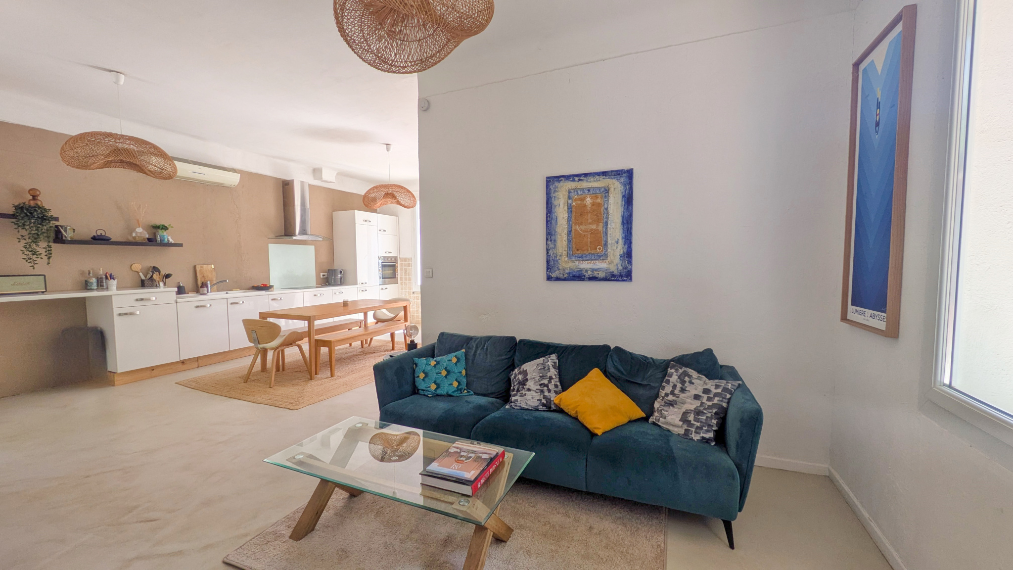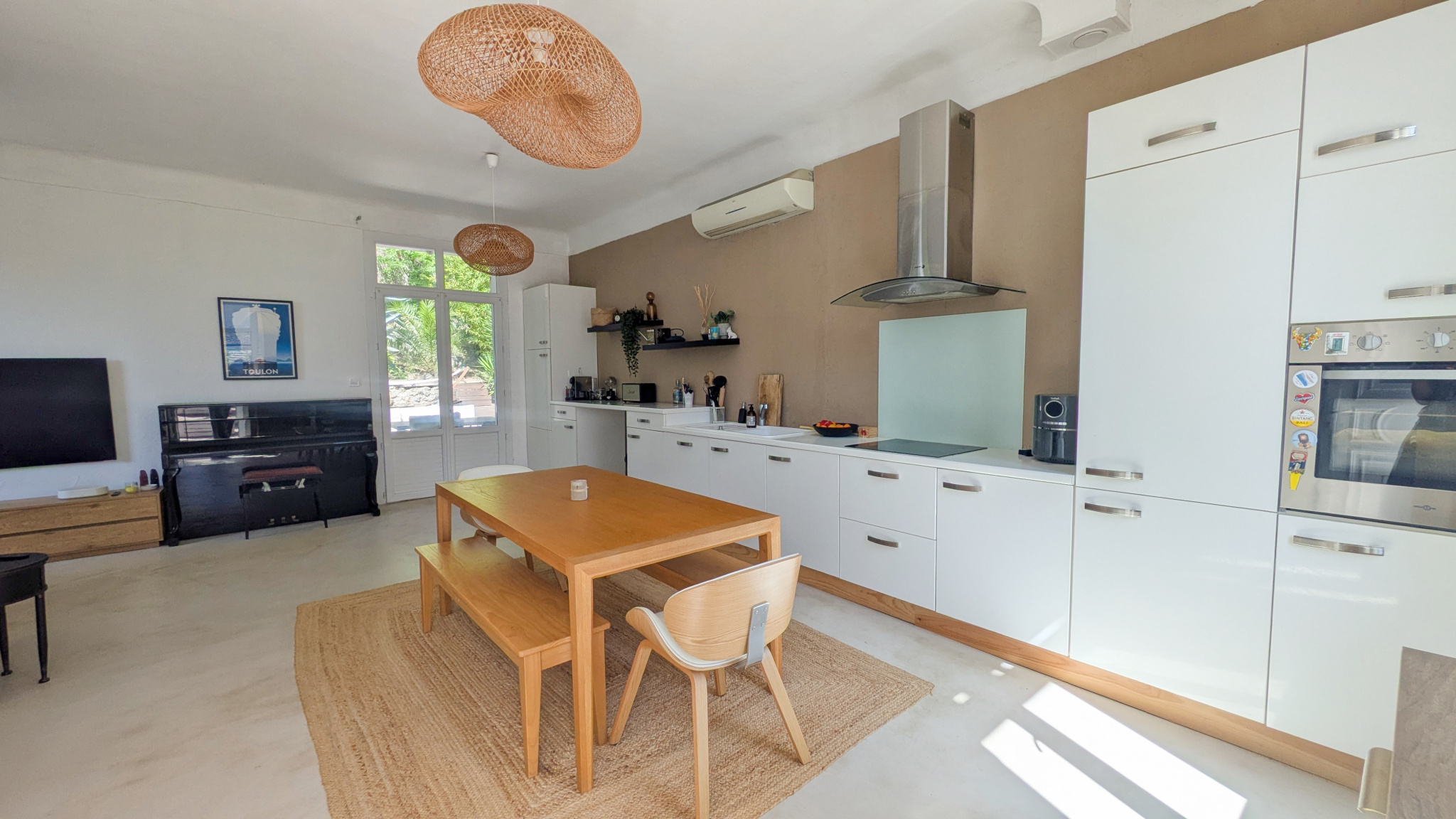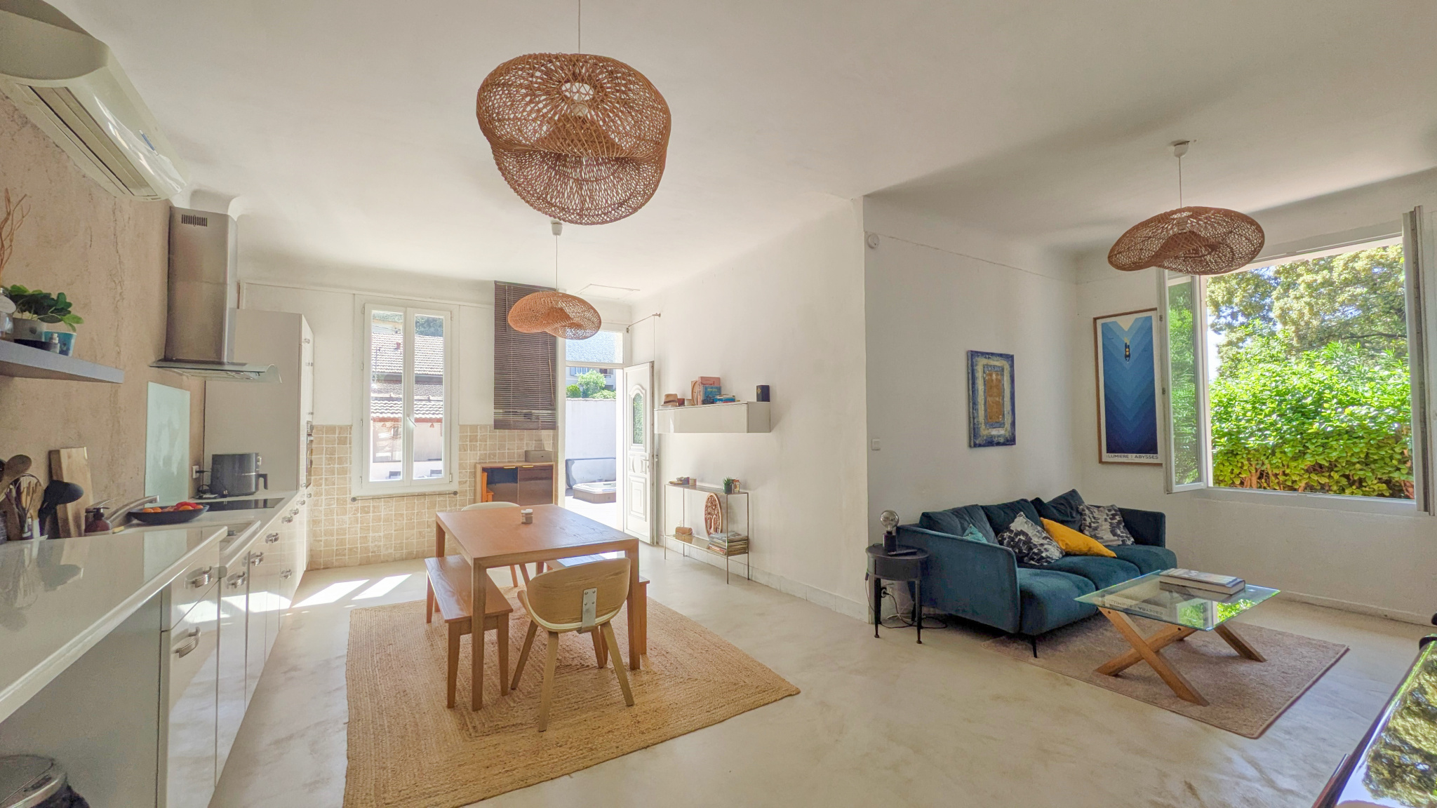 L’entrée ouvre sur une belle pièce de vie traversante d’environ 40 m2, composée d’un séjour, d’une salle à manger et d’une cuisine ouverte entièrement équipée. Lumineux et fonctionnel, cet espace séduit par son ambiance conviviale et son joli sol en béton ciré. La maison offre également trois chambres, une salle d’eau avec WC, ainsi qu’une buanderie avec douche et WC supplémentaires, accessible depuis la terrasse.