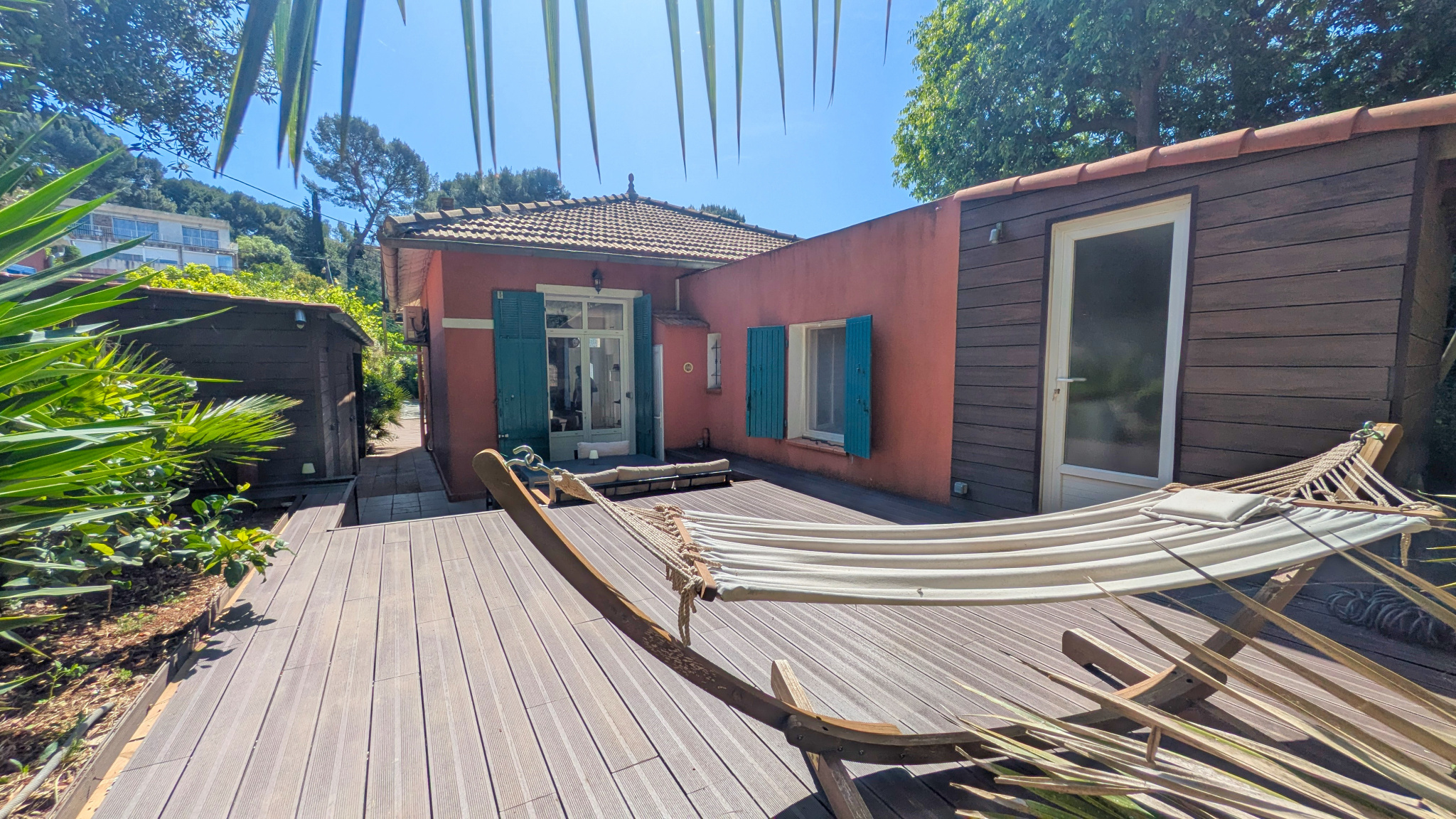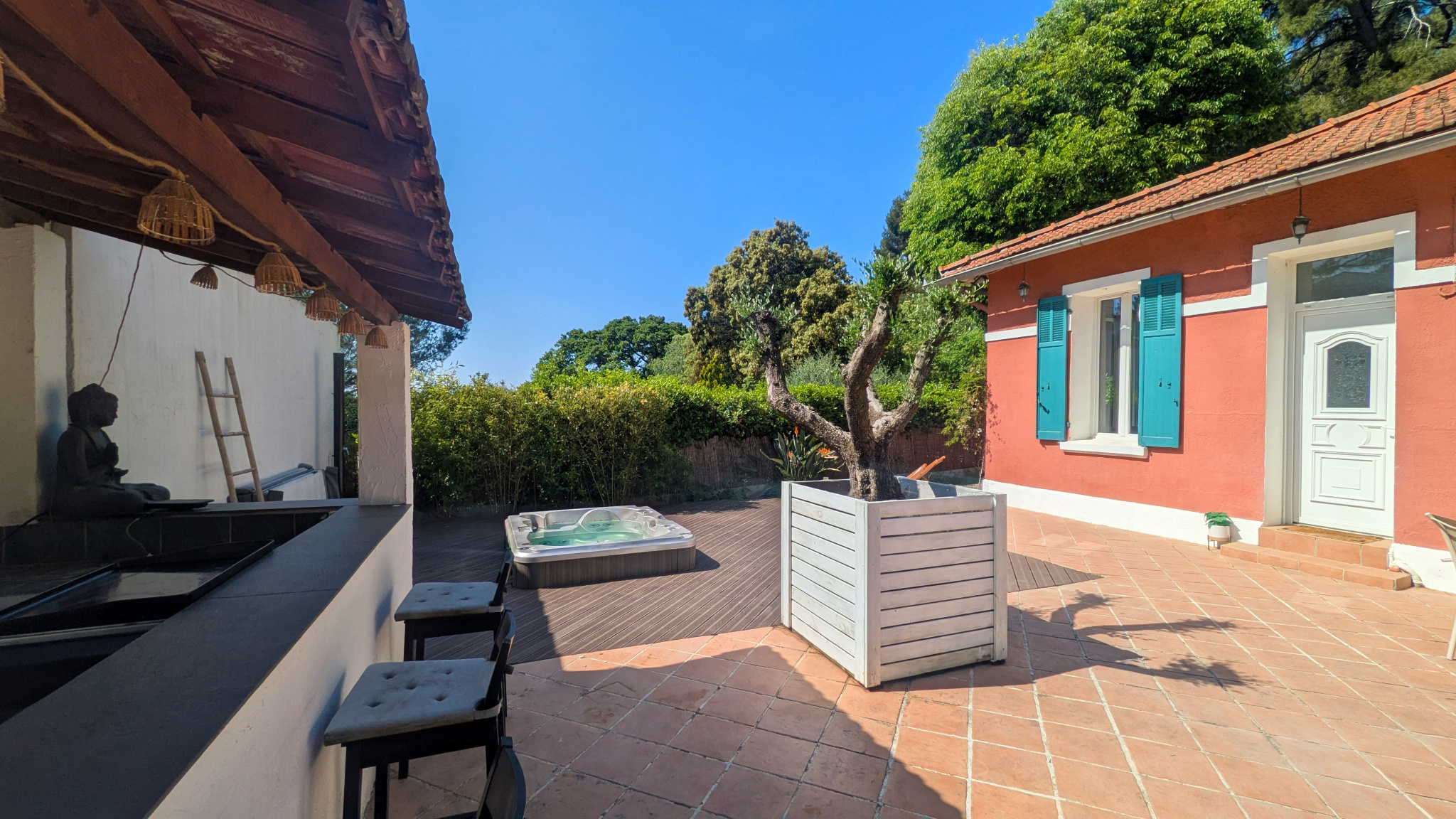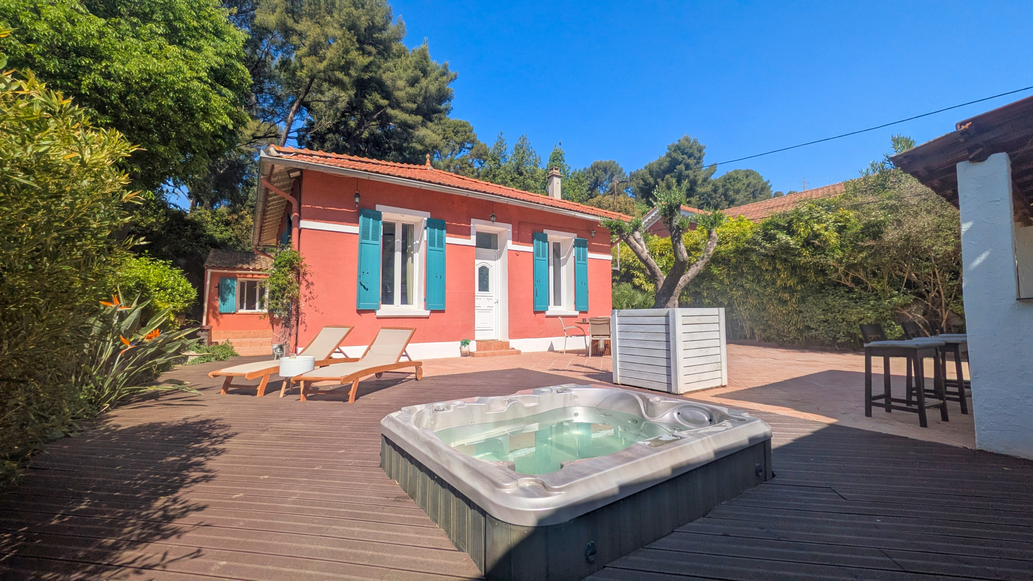 À l’extérieur, tout a été pensé pour profiter pleinement des lieux, dans une ambiance intimiste, à l’abri des regards. Les terrasses récentes en composite, le jacuzzi semi-encastré, la douche extérieure ainsi que le bar / cuisine d’été promettent de très beaux moments de détente et de convivialité en famille ou entre amis. Deux terrasses, aménagées de part et d’autre de la maison, permettent de profiter des différents espaces extérieurs selon les envies et les heures de la journée. La propriété permet également le stationnement de deux véhicules.